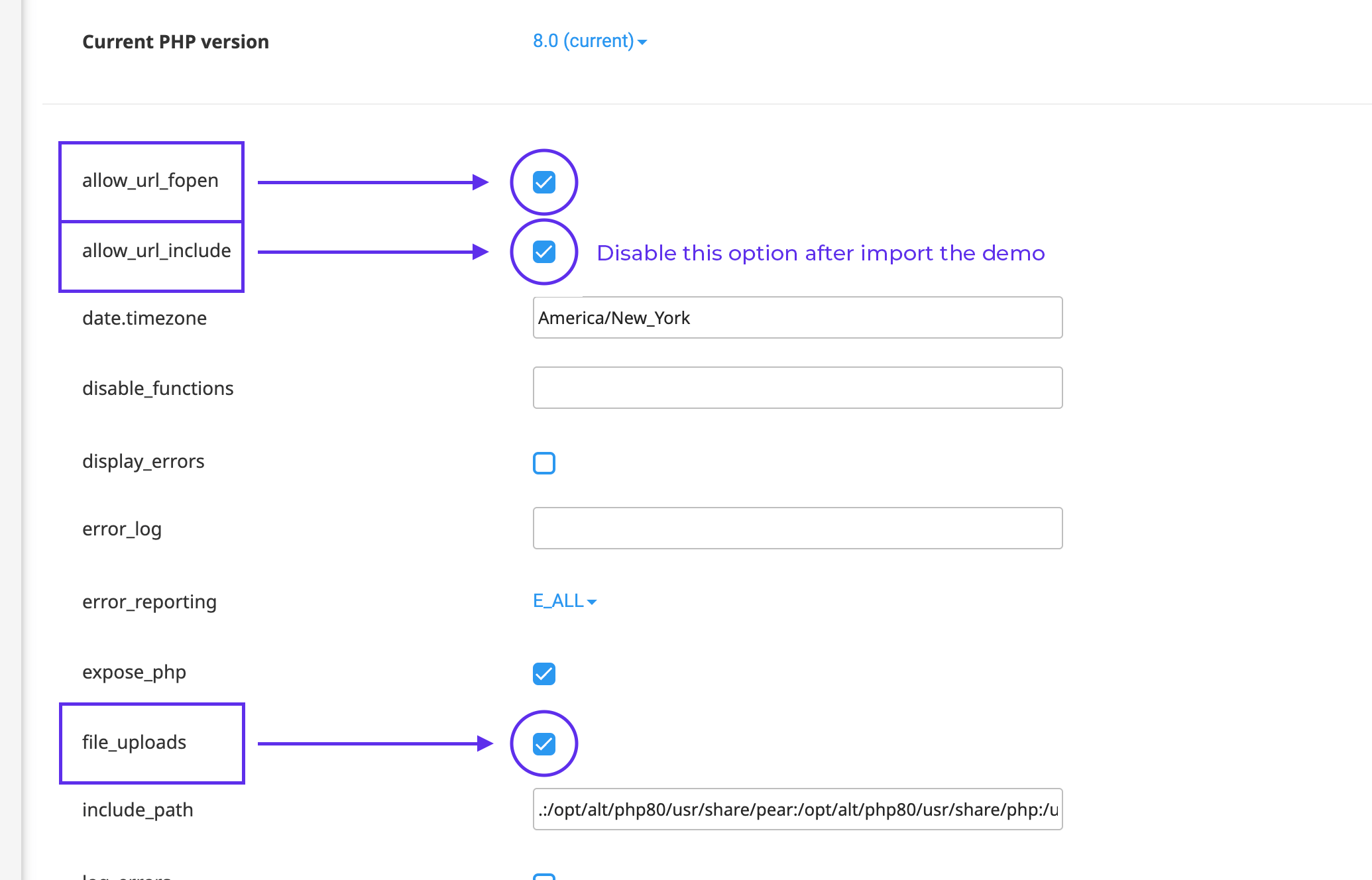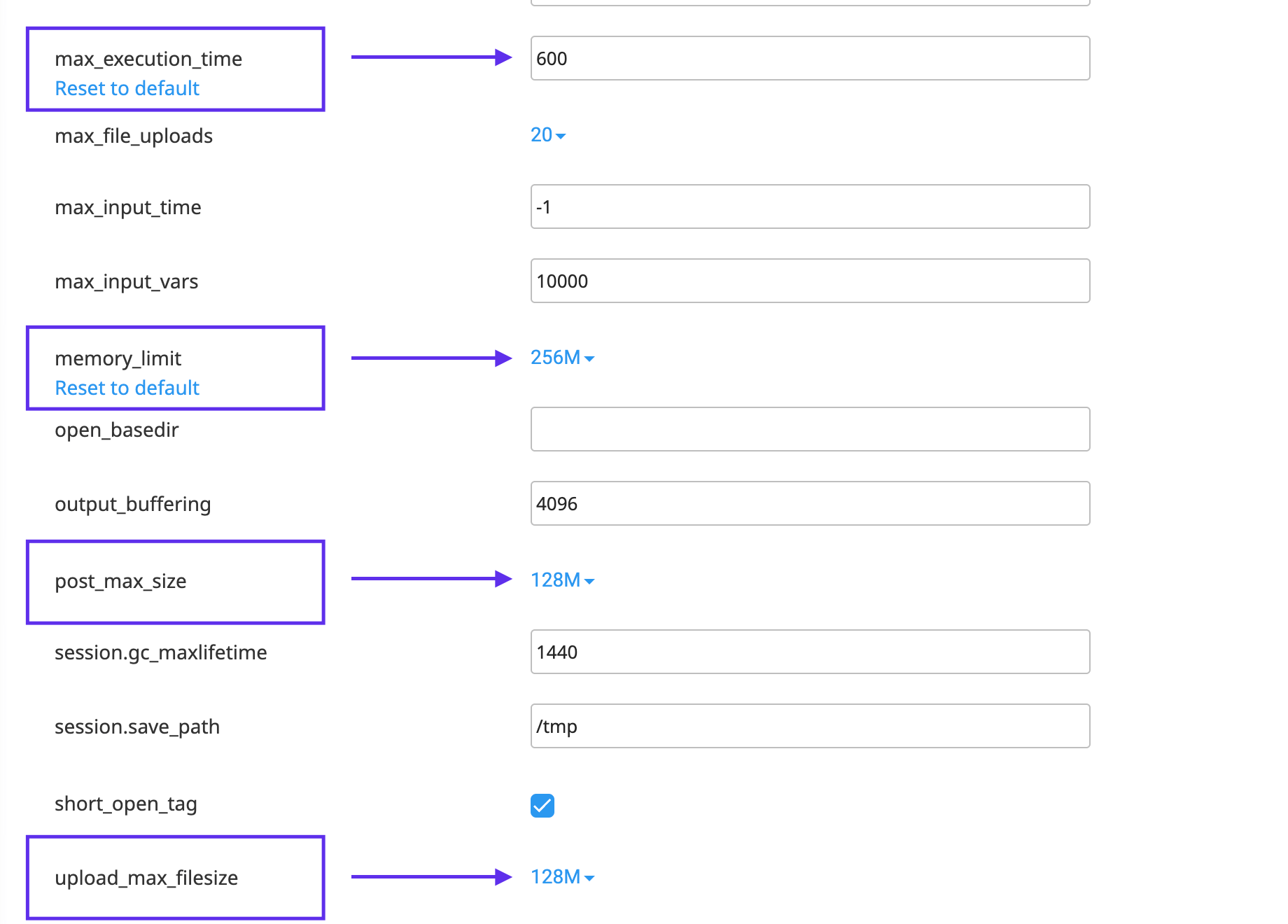max_execution_time = 1200 memory_limit = 264M post_max_size = 128M upload_max_filesize = 128M
